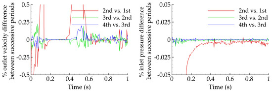 A constant cardiac cycle of one second is assumed for all simulations and four cycles are considered before the results are collected, to ensure that all transient effects are washed out. This can be observed in Figure 3, where the percentage errors for the outlet velocity magnitude and inlet pressure are plotted for successive periods. The error between periods three and four (blue solid) is always less than 0.25%, making period five appropriate for data collection.