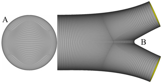 In all cases, the solid model is produced by SolidWorks and meshed with ANSA (BETA CAE Systems S.A., Yokohama, Japan) using a pure hexahedral mesh. Hexahedral meshes require a fewer number of elements compared to tetrahedral or prismatic ones for a fixed level of accuracy, as shown in [26]. A sufficient number of elements is clustered close to the wall in order to capture high-velocity gradients. Figure 5 presents the inlet mesh (A) and part of the surface mesh (B) close to the bifurcation area.
