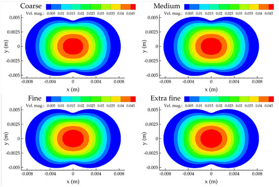 Figure 6 presents the contours of the velocity magnitude for all meshes considered at the z = 0 plane, defined as the normal to the inlet plane where the three centerlines meet. No apparent differences can be observed; they all share the same qualitative features. The velocity field is characterized by small values close to the wall due to the no-slip boundary condition, and with larger values at the center of the computational domain.