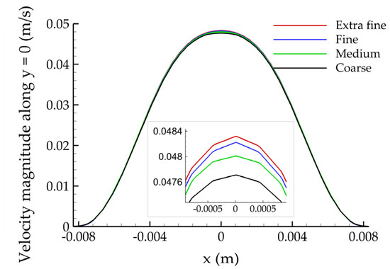 Plot of the velocity magnitude along the y = 0 line of the z = 0 plane for the four mesh refinements.