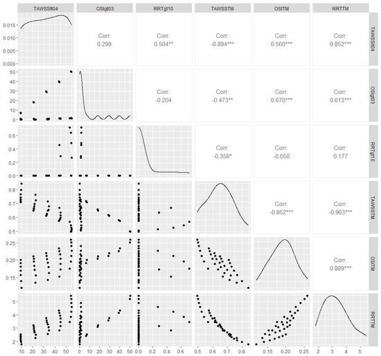 Scatterplots (lower diagonal), density plots (diagonal), and estimated Pearson’s correlation (upper diagonal) for the hemodynamic variables reported in Table 4; weak, moderate and strong evidence against the null hypothesis of zero linear association is depicted with *, ** and ***, respectively. TAWSSlt04, OSIgt03, and RRTgt10 denote, respectively, the percentages of the total graft area with TAWSS < 0.4 Pa, OSI > 0.3, and RRT > 10 Pa−1. Similarly, TAWSSTM, OSITM, and RRTTM correspond to TAWSSTM, RRTTM, and OSITM, respectively.