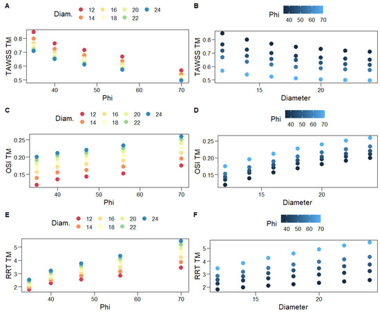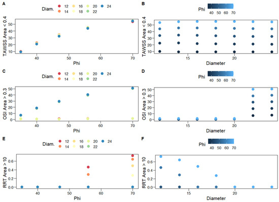 Scatterplots for the associations of the percentages of the total graft area with TAWSS < 0.4 Pa (A,B), OSI > 0.3 (C,D), and RRT > 10 Pa−1 (E,F) (thrombogenic stimulating environments) with graft limb angles, φ, and diameters, D. Different colors are used for increasing levels of D (left column) and φ (right column).