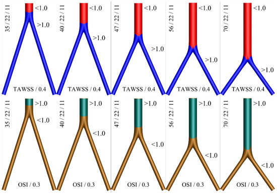 Two color contours for thrombogenic conditions as expressed by the variables TAWSS/0.4 < 1 (top) and OSI/0.3 > 1 (bottom), for D = 2d = 22 mm. The (blue) red and (brown) green colors depict the (non) thrombus prone areas.