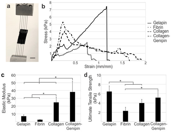 Mechanical properties of extracellular matrix hydrogels alone. (a) Tensile setup for a gelapin hydrogel sample. (b) Average stress–strain graphs of 10:2% gelapin, 9.6 mg/mL fibrin, 4 mg/mL collagen, and 4 mg/mL—2% collagen–genipin demonstrate the (c) elastic moduli and (d) ultimate tensile strength varied significantly between optimized hydrogels. * Denotes significance between groups (p < 0.05). Scale bar = 5 mm.