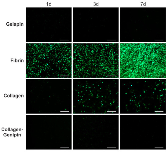 Genipin Crosslinking Inhibits Fibroblast Viability and Proliferation. The cellular proliferation and morphology of fibroblast-embedded hydrogels were assessed through fluorescent live cell imaging over a 7 d period (Figure 3). After 1 d, fibrin gels were noticeably more cell populated demonstrating the cellular compatibility of the fibrinogen and thrombin precursors. Gelapin and collagen–genipin gels showed limited cell survival. Fibroblast morphology exhibited limited cell spreading and live cells were present in all gel types. Following 3 d of culture, PtFibs readily proliferated in fibrin and collagen matrices. However, fibrin encouraged morphological changes from condensed rounded cell bodies towards an elongated spindle shape. The differences in cell proliferation and shape between fibrin and collagen gels became more apparent on day 7 where fibrin yielded highly populated gels consisting of interconnected networks of elongated PtFibs. Conversely, collagen gel cellularity was similar to day 3 and cell morphology remained rounded with limited cell-to-cell connections.