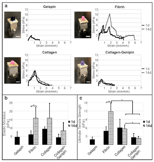 The tensile mechanics between optimized hydrogels of each group varied significantly as shown by the average stress–strain curves (Figure 2). Collagen-based gels were significantly stiffer than fibrin and gelapin (p < 0.05) (Figure 2b). The addition of genipin to collagen gels resulted in a significantly higher elastic modulus compared to collagen alone (p < 0.05). The ultimate tensile strength of gelapin was significantly stronger than fibrin and collagen alone (p < 0.05).