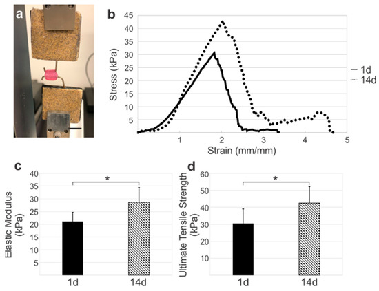 Circumferential strength of fibrin-coated vessels increased over time. (a) Circumferential tensile setup and (b) average stress–strain graphs of fibrin coated adventitia vessels after 1 d and 14 d of culture. Prolonged culture resulted in significantly higher (c) elastic moduli and (d) ultimate tensile strength. Scale bar = 10 mm. * Denotes significance between groups (p < 0.05).