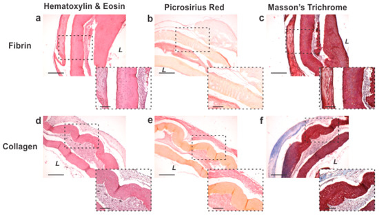 Adventitia vessel histology reveals cellular organization and collagen production. Hematoxylin and eosin staining of (a) fibrin- and (d) collagen-coated vessels show a robust cellular layer bordered by fibrin hydrogel and localization of the exterior coating on the abluminal surface. (b,e) Picrosirius Red and (c,f) Masson’s Trichrome showed collagen presence within the tissue. Collagen was observed in both fibrin and collagen hydrogel groups with evidence of more collagen in the collagen group. L indicates lumen area. Scale bar of 4× images = 500 µm. Scale bar of magnified 10× images (dashed border) = 200 µm.