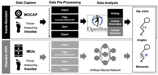 While highly successful (relative root mean square error (rRMSE) = 15%; relative to predicted average and ground truth moment ranges; R2 = 0.85), upright walking was the only activity captured in that investigation. Although that task is common and easy to capture, it may not represent the most critical ADL to monitor before or after THA. In contrast, stair ascent requires increased function (i.e., greater range of motion (ROM), improved balance, etc.) before/after surgery and may represent a more specific and sensitive ADL for evaluating function in these patients. Accordingly, the focus of this study utilizes a similar approach to create and validate a ML algorithm (wearable-ANN approach) capable of computing 2D (sagittal/frontal plane) hip joint kinematics/kinetics using IMUs affixed to the shin and thigh and one force-instrumented insole under the ipsilateral foot during stair ascent. As in other studies that develop computational algorithms, our investigation used healthy individuals as a first attempt in creating this novel approach [,,,]. All three sensors (2 × IMUs, 1 × force-instrumented insole) had input data streams for an ANN (2 hidden layers, 10 total nodes) (Figure 1 Bottom). The performance of this algorithm was compared with gold-standard optical MOCAP and force-measuring insole data inputs for OpenSim (Figure 1 Top). Force-instrumented insoles were selected in favor of force plates in order to collect repeated gait cycles while performing stair ascent. As in prior investigations, the wearable-ANN approach would be considered successful if average rRMSE was less than 13% [,]. Thus, we hypothesized that all variables (sagittal angle, sagittal moment, frontal angle, frontal moment) would achieve rRMSE < 13%.