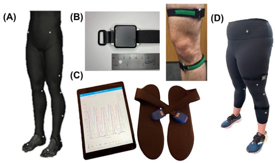 Sensing modalities: (A) MOCAP markers (Helen Hayes lower body; 19 markers). (B) Left: APDM Opal IMU, Right: IMU attachment to thigh and shank. (C) Loadsol iPad application and force-instrumented insoles. (D) Example instrumented subject with all sensing modalities placed appropriately.