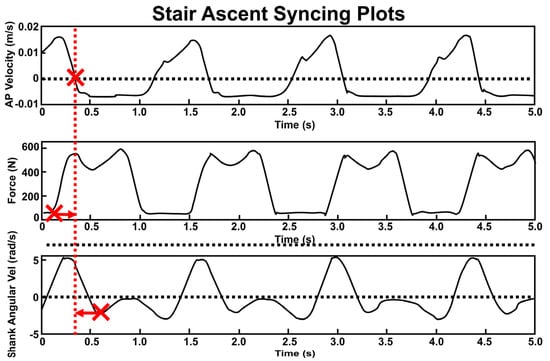 Data were pre-processed to prepare raw data for respective workflows (OpenSim traditional biomechanical modeling workflow with optical MOCAP and insole data versus MATLAB ANN development/validation workflow with IMU and insole data (see Figure 1)). For all subjects, the stair ascent trial with the least MOCAP marker trajectory loss was utilized for final analysis. MATLAB scripts were written for filtration and temporal synchronization using gait-cycle analysis (Figure 3) across all sensing modalities. Finally, filtered and synchronized data were separated and passed to the respective workflows (traditional modeling vs. ANN development/validation).