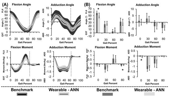 (A) Continuous metric data as a percent of the gait cycle and (B) Discrete metric data at specific points in the gait cycle displayed as group average hip joint angles (top) and moments (bottom) computed using gold−standard method (black) and wearable−ANN method (grey) for stair ascent. Toe off at 66% gait cycle is indicated by vertical lines. * p < 0.05.