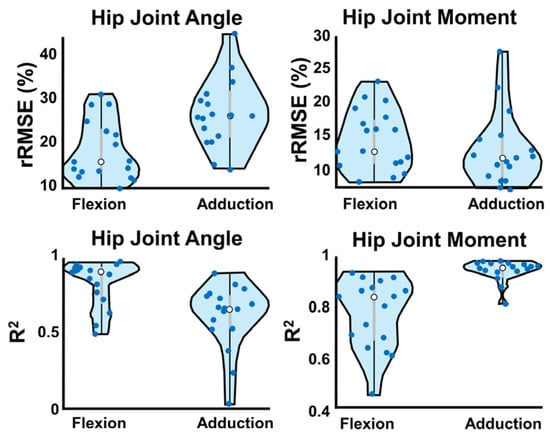 Violin plots (Figure 5) show wearable-ANN performance variability across subjects. Dots represent average subject performance as the validation set across rounds (white dot = median, grey bars = IQR). The wearable-ANN approach predicted sagittal plane angle well (i.e., wide, short violin near R2 = 0.9; R2 min~0.5); however, it had more variability predicting sagittal moment (i.e., elongated violin with two peaks at R2~0.9 and 0.6). Adduction moments were predicted with high accuracy (0.8 < R2 < 0.99). Predicting adduction angles varied more widely across subjects (0 < R2 < 0.92).