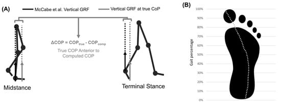 (A) Error caused by vertical GRFs being applied to the talus. Solid arrows represent vertical GRF (black = benchmark this study, grey = true CoP vertical GRF). Dotted lines show line of action and lever arm of vertical GRF about hip joint center. (B) Center of pressure path during stance.