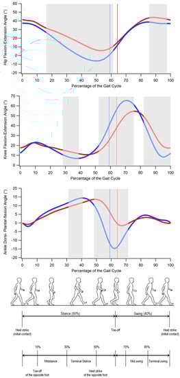 From top to bottom: hip flexion and extension, knee flexion and extension, and ankle dorsiflexion and plantar flexion angles during gait cycle in individuals with SCA 38 (red) and unaffected individuals (blue). The solid lines indicate transition from stance to swing phase. Grey-shaded areas denote the periods of the gait cycle in which a significant difference between groups exists (p < 0.05). (Gait cycle picture adapted from Ref. [22].)
