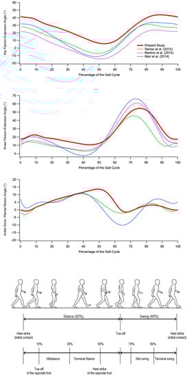 - significantly larger hip flexion approximately from midstance to the end of the stance phase (16% to 62% of the gait cycle) and in the terminal swing (86% to 98% of the gait cycle);