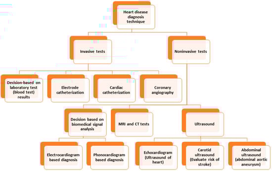 Conventional invasive methods for heart disease detection depend on laboratory tests, physical tests, investigation by a physician, etc. []. Among the invasive techniques, angiography and catheterization are prominent. Catheterization is a medical procedure in which a thin, flexible tube called a catheter is inserted into a blood vessel to diagnose and treat heart conditions. Angiography is a medical imaging technique that uses X-rays and a contrast agent to visualize the blood vessels inside the body. Both methods suffer from limitations, such as invasiveness (risking bleeding or infection), limited access, expensiveness, or limited visualization, which hinders obtaining a scenario of a specific time, etc. [,]. Computed Tomography (CT) and Magnetic Resonance Imaging (MRI) are commonly used to detect and diagnose heart disease. Both modalities have limitations, which include requiring the patient to be still in a particular position, exposure to ionizing radiation, expensive procedures, inability to detect mild or early-stage heart disease, etc. [,]. The limitations of ultrasound to detect heart disease are limited resolution, failure to detect minor abnormalities, lack of ability to penetrate through bone or dense tissues, need for a skillful operator, limited use for patients with pacemakers, etc. []. Figure 1 depicts the different diagnostic techniques for heart disease.