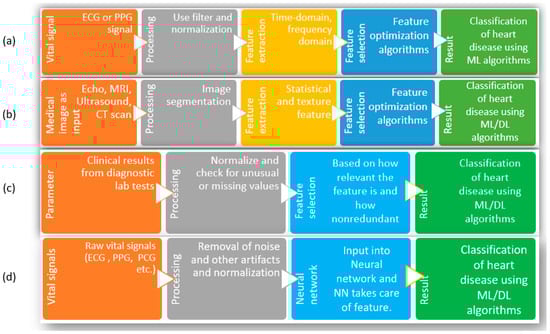 Different methods of heart disease classification using ML and DL. (a) Input as vital signs and extraction of features, (b) input as images (Echo, MRI, ultrasound, CT scan), (c) input as clinical parameters, (d) input as raw vital signs.