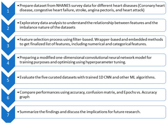 In this study, the database chosen was from the National Health and Nutrition Examination Survey by CDC []. The reasons behind the choice are that it is a large dataset with a significantly higher number of relevant clinical parameters covering a wide range of periods. Although the dataset was not available for input for the model, it is possible to accumulate the data from several years and surveys. The dataset used in this study was prepared by compiling NHANES data from 1999–2000 to 2017–2018. In NHANES, different categories of data are stored in different sections of the database; for heart disease diagnosis, the sections used are demographic, examination, laboratory, and questionnaire data. Since the datasets involved both numerical responses as well as categorical responses, there needed to be refinement in terms of eligibility for heart disease diagnosis and preparation for input to the algorithm for training. The patient’s record of heart diseases such as coronary heart disease, stroke, heart attack, angina pectoris, and congestive heart disease was used as a class variable for any ML or DL technique.