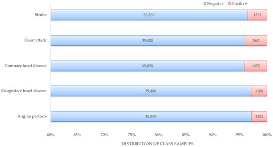 These data were published in February 2020, focusing on three consecutive blood pressure measurements and heart rate/pulse to obtain accurate BP numbers. Each data documentation has a detailed description of the eligible sample, protocol and procedure, and data processing and editing. Unlike the other datasets used in recent research articles, this makes the NHANES the most organized and systematic collection of data that can be used for heart disease diagnosis. In Figure 4, the distribution of patient class is depicted. The dataset preparation process started with locating NHANES survey data from the CDC website from 1999–2000 years until 2017–2018 years. Under each year, data sections were named: demographics data, dietary data, examination data, laboratory data, and questionnaire data. Based on the responses found about the presence and type of heart disease, five separate datasets were prepared, one for each heart disease: stroke, heart attack, coronary heart disease, congestive heart disease, and angina pectoris.