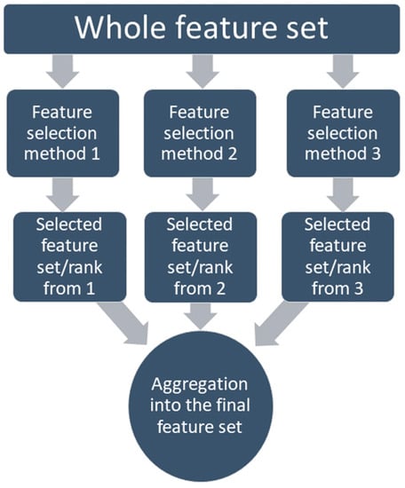 On the other hand, the regularization-based methods (lasso, ridge, elastic, etc.) use penalization. This can discard the redundant features (lasso) or decrease them to a minimal value (elastic); on the other hand, these still detect the interactions among features [,]. Many studies have compared the performance of the different methods with different classifiers and concluded that there is no such ‘perfect feature selection method’ for all problem types [,,,,,]. That is why the feature selection method which was chosen for this study is based on the ensemble method, where the feature selection methods are combined so the different strengths can be combined []. Several studies have proved that the ensemble-based feature selection method outperforms the single-feature selection methods if the computational load is not a concern [,,]. Along with performance, the ensemble-based method also has proven to have more stability in the system by allowing a minor change in data, which means becoming more robust []. In this study, an aggregation-based ensemble method was applied, which allows combining the feature set achieved from different methods into one set through either union (liberal approach) or intersection (restrictive approach), or staying between those two using a threshold, as shown in Figure 5.