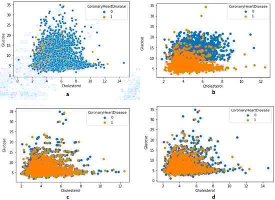 The distribution of features along with class variables (no-CHD—0, CHD—1). (a) Total distribution (no undersampling), (b) using undersampling NearMiss version 2, (c) using undersampling NearMiss version 3, (d) using an undersampling condensed nearest-neighbor.