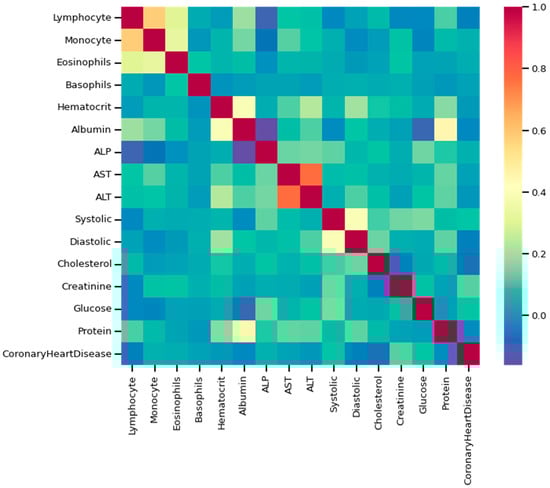 As discussed, the dataset was prepared using survey data from NHANES; the modules used here are demographic, examination, laboratory, and questionnaire data. An example of mathematical description of the dataset using some of the features as an example has been given in Table 2, and data distribution considering CHD/no-CHD was depicted in Figure 8. After removing the missing and outlier values, the total number of instances was 40,713. Since the sequence number, family income, height, insurance, etc., information did not have diagnostic significance, those columns were dropped from the primary dataset. In addition, not all the features or column variables were numeric data, such as Gender, Diabetes, Vigorous-work, Moderate-work, etc., so those data were modified from categorical to numeric by dividing each of the columns into multiple columns. After dropping the mentioned columns and distributing the categorical columns, the final dataset contained 40,713 rows and 47 columns, including the class variable (CHD). An example of a correlation matrix has been depicted as a heatmap using a subset (15) of randomly chosen features chosen along with the target variable in Figure 9.