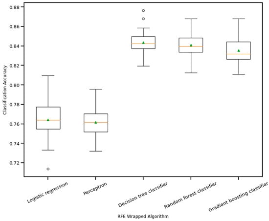 Boxplot of Recursive feature elimination wrapped algorithm vs. classification accuracy. The green triangle and the orange line indicate mean and median value of model accuracy respectively.