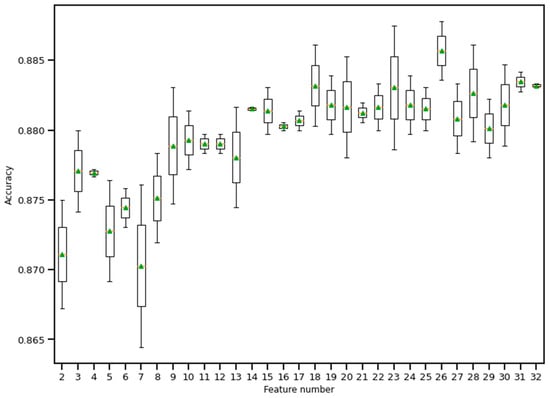 Boxplot of Recursive feature elimination technique for feature selection. Here, a random forest classifier has been used to find the accuracy as features keep entering into the selection set. The green triangle and the orange line indicate mean and median value of model accuracy respectively.