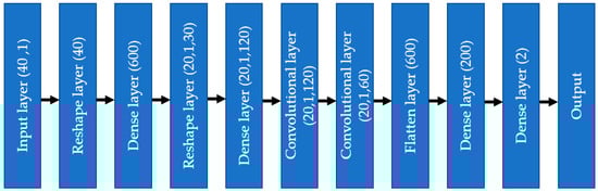 The one-dimensional convolutional neural network (1D CNN) started with the input from the finalized selected feature list, consisting of numerical and encoded categorical features. Each categorical feature was divided into several features by one hot encoding, making the total feature number 40. The input went through a dense layer to mix the features well, so that the issue of the chronology of features did not make any difference. The number of nodes in the first dense layer was 600, with an activation layer as ‘relu’ and dropout as 0.3. As discussed in the previous section about removing the dependency on the chronology of features, the dense layer output was reshaped into 20 channels, 1 × 30 shape.