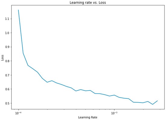 Apart from the weight assignment to class variables, another important optimization was the learning rate. To find the optimum learning rate, a semilog-based plot was created, using the data from the learning rate range and loss parameters, as shown in Figure 13.