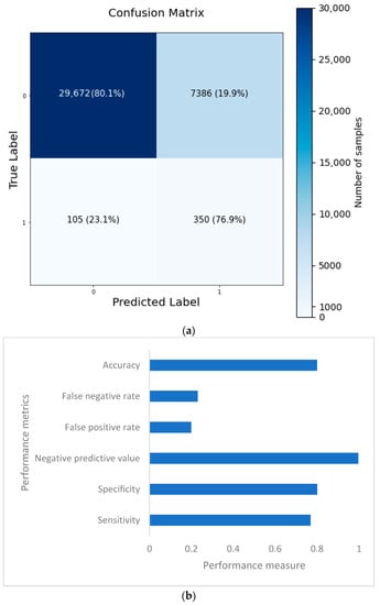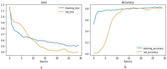 The confusion matrix is depicted in Figure 14a, and the performance metrics are plotted in Figure 14b. It is evident that, despite a significant imbalance in the dataset, the implementation of 1D CNN brought forth improved accuracy. Figure 15a shows the loss vs. epochs graph. Although the loss was initially high (approximately 25 epochs), the loss steadied around 0.4. Also, in Figure 15b, the accuracy of the model vs. epochs graph is depicted. The accuracy of the validation set started slow. However, at 15 epochs, it was close to the training accuracy and kept increasing slowly to 30 epochs.