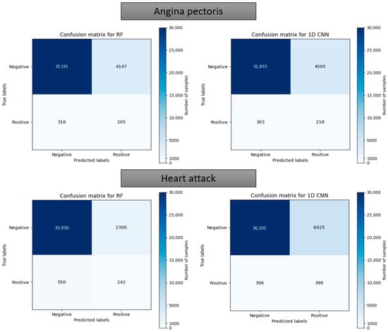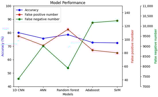 The imbalanced dataset’s main challenge was that many models’ accuracy may be high. However, in nearly all cases, the accuracy came as a sacrifice, also causing a very high false negative number. As seen in Figure 16, the false negative number is the lowest in the case of 1D CNN, while accuracy simultaneously remained the highest. Alternatively, the false positive number might be improved in the random forest classifier compared to 1D CNN, but with lower accuracy and a higher false negative number.