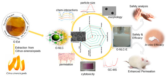 In this study, a sustainability approach was introduced, where orange peels extract was evaluated for antiaging activity and heavy metals concentration (safety). They were then loaded into NLCs (O-NLC) based on green surfactants (rhamnolipids) and characterized before loading into a secondary emulsion-based formulation (topical O/W emulsion) (O-NLC-E) as explained in Figure 1. For further assessments, physico-chemical characterization of O-NLC-E was performed and their ex vivo permeation was analyzed. For the in vivo evaluation, human volunteers were considered after their written consent were given and safety studies were conducted. The results showed a good safety profile and high antiaging efficacy. This sustainability approach was introduced; ① for the shelter of substantial bioactive compounds when applied to skin, ② to overcome the penetration barriers and improve the bioavailability of O-Ext, ③ to avert the enzymatic interaction, ④ to keep smooth antioxidant activities against oxidative stresses, ⑤ to improve economic and social acquiescence, and ⑥ providing the topical treatment with ease to fend off oxidative skin problems and early skin aging. Here, we offered a unique sustainability approach to defend the skin aging with naturally existed potential and superb biosafety.
