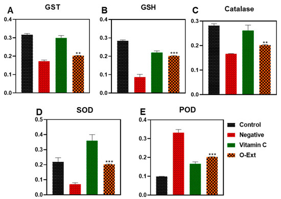 Effect of O-Ext on antioxidant enzymes using macrophages (A) GST, (B) GSH, (C) Catalase, (D) SOD, (E) Peroxidase. Data are presented as mean ± SD (n = 3). Where ** p < 0.01, *** p < 0.001.