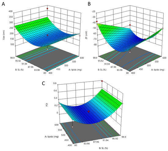 To obtain optimized NLCs, the Box–Behnken model was used; 15 Formulations were produced to find out the effect of independent factors (amount of lipids mixture, solid lipid (cetyl alcohol) amount in lipids mixture, surfactant amount) on dependent factors (Size (nm), zetapotential (mV) and polydispersity index) as shown in Table S2. The composition of produced formulations and their results are shown in Table S1. Suggested optimized formulation with predicted and actual results are shown in Table S3.