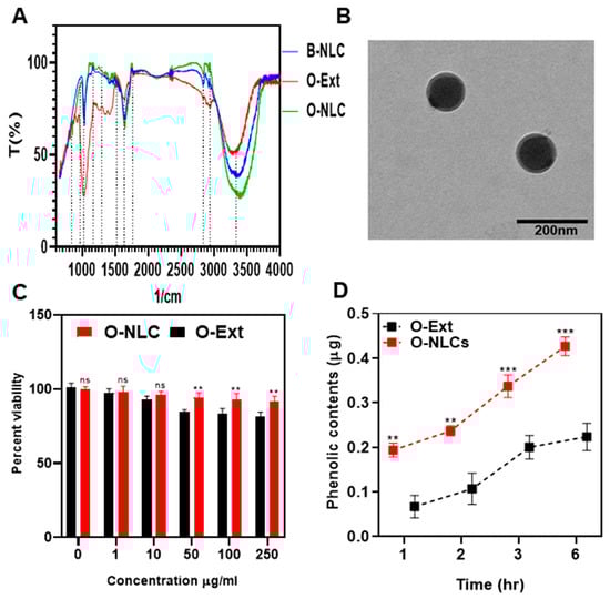 To confirm the entrapment of O-Ext in O-NLCs and the interaction between B-NLCs components and extract, FTIR-spectroscopy (Tensor 27, Bruker, Nijmegen, The Netherlands) was performed [26,28].
