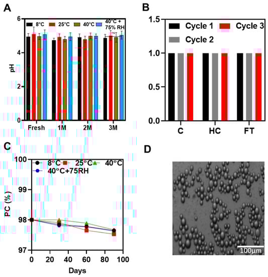 Accelerated thermodynamic stability tests are known worldwide as suitable for guessing the shelf-life of formulations [36]. In thermodynamic stability studies, 3 cycles of centrifugation (C) at 5000× g rpm for 5 min and heating–cooling (HC) cycle, and 4 °C for 48 h, followed by 45 °C for 48 h, were conducted. In freeze–thaw (FT) cycles, the formulation was kept [37].