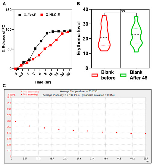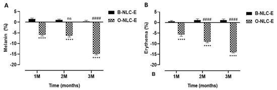 Patch testing was used to perform safety testing (B-NLC-E versus O-NLC-E) on the forearms of 11 participants under ethical committee approval CIIT/ATD/BSC/17-07 [40]. An area of 5 cm × 4 cm on both forearms was blotted. Baseline erythema levels were determined using a probe fitted to the Multi-Skin-Test Center MC 1000 (Kazak, Gebraucht, Germany). Self-application by B-NLC-E and O-NLC-E volunteers was used. Each was applied to the blotting regions on each forearm in separate tests (B-NLC-E versus O-NLC-E). Following treatment of the B-NLC-E and O-NLC-E, the areas were covered with surgical dressing. After 48 h, the dressings were removed and the amount of erythema on both forearms was measured again [41,42,43].