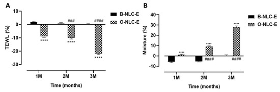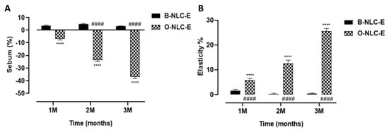 Sebum contents after 1st, 2nd, and 3rd month (A); elasticity level after 1st, 2nd, and 3rd month (B) after application of O-NLC-E. Percent change in skin sebum and elasticity after 1st month (1 M), 2nd month (2 M), and 3rd month (3 M) by ap-plying O-NLC-E, along with their respective B-NLC-E. # shows significance difference between O-NLC-E readings taken at different time intervals (1M: standard) and * shows significance difference between O-NLC-E and their respective B-NLC-E. #### and **** indicates p < 0.0001, n = 11.