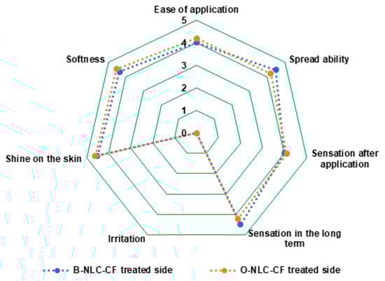 To analyze the effectiveness of O-NLC-E and their respective B-NLC-E, a questionnaire was prepared. B-NLC-E received average points for questions relating to the application, spreadability, sensation just after application, long-term sense, irritation, shine on the skin, and softness, represented in Figure 12. We applied a paired sample t-test and found a negligible pairing difference between the average points of sensorial questioners regarding formulations O-NLC-E, and their respective base (B-NLC-E) at different time intervals. Therefore, we concluded that there were no huge changes between formulations O-NLC-E and their respective B-NLC-E regarding the sensory evaluation. Loaded formulations and their respective bases demonstrate similar performance after sensorial analysis. However, silica used as a sensory modifier with surfactants in formulations has played well in addition to sensory attributes of formulations [73]. It is reported from the analysis that formulations are admissible and suitable for topical use.