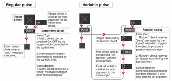 The signals used to generate RP and VP were controlled and manipulated in the Max/MSP environment. For RP (Figure 2), a fixed input argument at 1000 ms was used for the “metronome object” to control signals. Accordingly, the pulse duration and interval were set at 1000 ms. For VP, a sequence of pseudorandom numbers was used (Figure 2), which was generated through the “random object” in Max/MSP. A specific sequence of random numbers can be recalled and regenerated using a seed message into the “random object”. When the seed message is not specified, the “random object” uses the system clock as the seed message. The generated numbers alter between 0 and 1, less than any integer argument. To create a sequence with a lower limit of 1000 and an upper limit of 1500, 500 was used as an integer argument for the “random object”. Then, the “plus object” was used to add 1000 to the output numbers of the “random object”, and the output of the “plus object” was used as an input argument into the metronome object. Consequently, the pulse duration and interval varied between 1000 and 1500 ms.