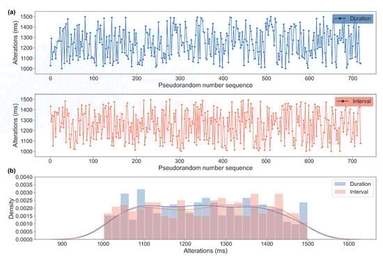 (a) Visual representations of a pseudorandom number sequence used for the Variable Pulse durations and intervals. (b) A density histogram analysis shows the distribution of the durations and intervals. The two colored lines, the kernel density estimations, illustrate an approximately uniform distribution of the series of numbers within the set range between 1000 and 1500.