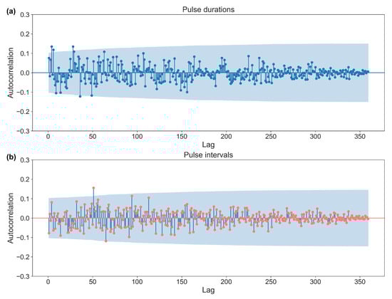 The autocorrelation analysis of a pseudorandom number sequence used for the varied (a) pulse durations and (b) pulse intervals. The maximum lag is 360 in this data set. Any data point falling within the blue shaded area ( = 0.05) indicates that it is not significantly correlated with the previous point. The analysis illustrates that the coefficient values of the autocorrelation are close to 0, and the consecutive numbers are mostly not significantly related in the sequence. Therefore, the sequence is most likely produced randomly.