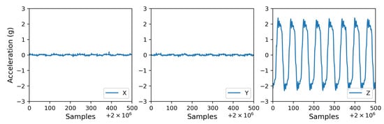 A comparison of the acceleration measurement of the vertical vibration setup between X, Y, and Z dimensions shows acceleration only in the Z (vertical) direction.