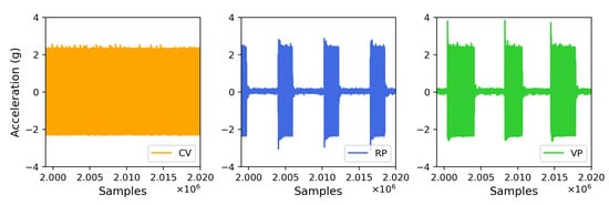 A comparison of measured acceleration between the experimental conditions. Note the continuous (uninterrupted) acceleration measured under Continuous Vibration (CV), rigidly the same pulse duration and interval under Regular Pulse (RP), and varying pulse duration and intervals under Variable Pulse (VP).