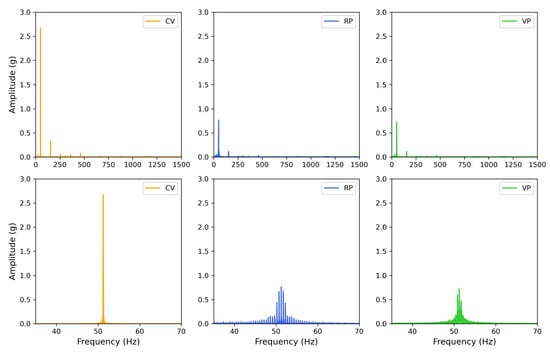 Fast Fourier Transform (FFT) analysis of the acceleration measurement of each experimental condition. (Top row) The full range of the FFT analysis shows a few minor peaks around the odd harmonics above the fundamental frequency. (Bottom row) The same FFT analysis zoomed in around 50 Hz to show the fundamental frequency (∼51 Hz) in the measured acceleration.