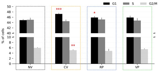 Cell cycle distribution in control (NV) and vibrated (CV, RP, VP) HeLa cells analyzed 24 h after vibration treatment. Red stars indicate a significant difference relative to the control (NV) cells. Flow cytometry dot plots showing the gating strategy are included in Supplementary Figure S1. * p < 0.05, ** p < 0.01, *** p < 0.001.