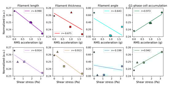 Correlation between the extracted features from the microscopic images (median filament length and thickness and mean filament angle) and characterized mechanical parameters (RMS acceleration and estimated shear stress). r is the Pearson correlation coefficient. Markers: NV—star, CV—circle, RP—square, VP—triangle.