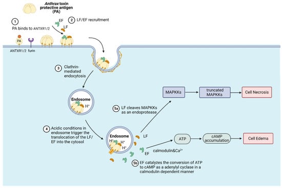 Anthrax toxin translocation mechanism. The anthrax toxin protective antigen (PA) first binds to the host cell membrane protein receptor anthrax toxin receptor ANTXR1/2 and then is cleaved by the host cell surface furin family protease to oligomerize. Then, the lethal factor (LF) and edema factor (EF) are recruited by PA oligomers, and the toxin complex is internalized by the host receptor-mediated endocytosis pathway. Acidic conditions within the endosome trigger the structural rearrangement and channel formation of PA for LF/EF translocation into the cytosol. Refolded LF cleaves cytosol target protein MAPKKs from the N-terminal, and refolded EF catalyzes the cAMP formation, thus inducing cell necrosis and edema, respectively. This image was adapted from “Mechanism of Action-Diphtheria Toxin” by BioRender.com (2023), accessed on 9 May 2023. Retrieved from https://app.biorender.com/biorender-templates, accessed on 9 May 2023.